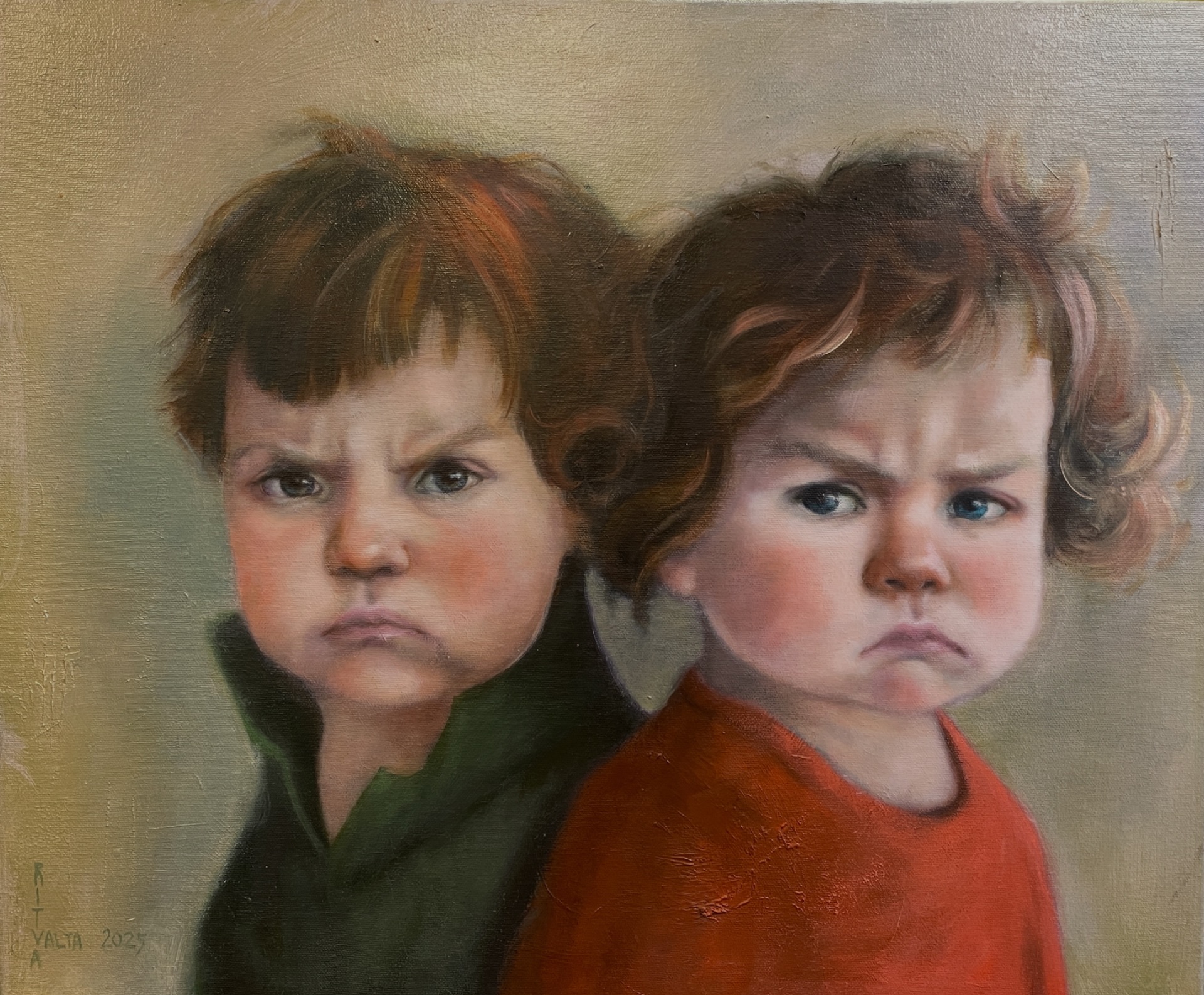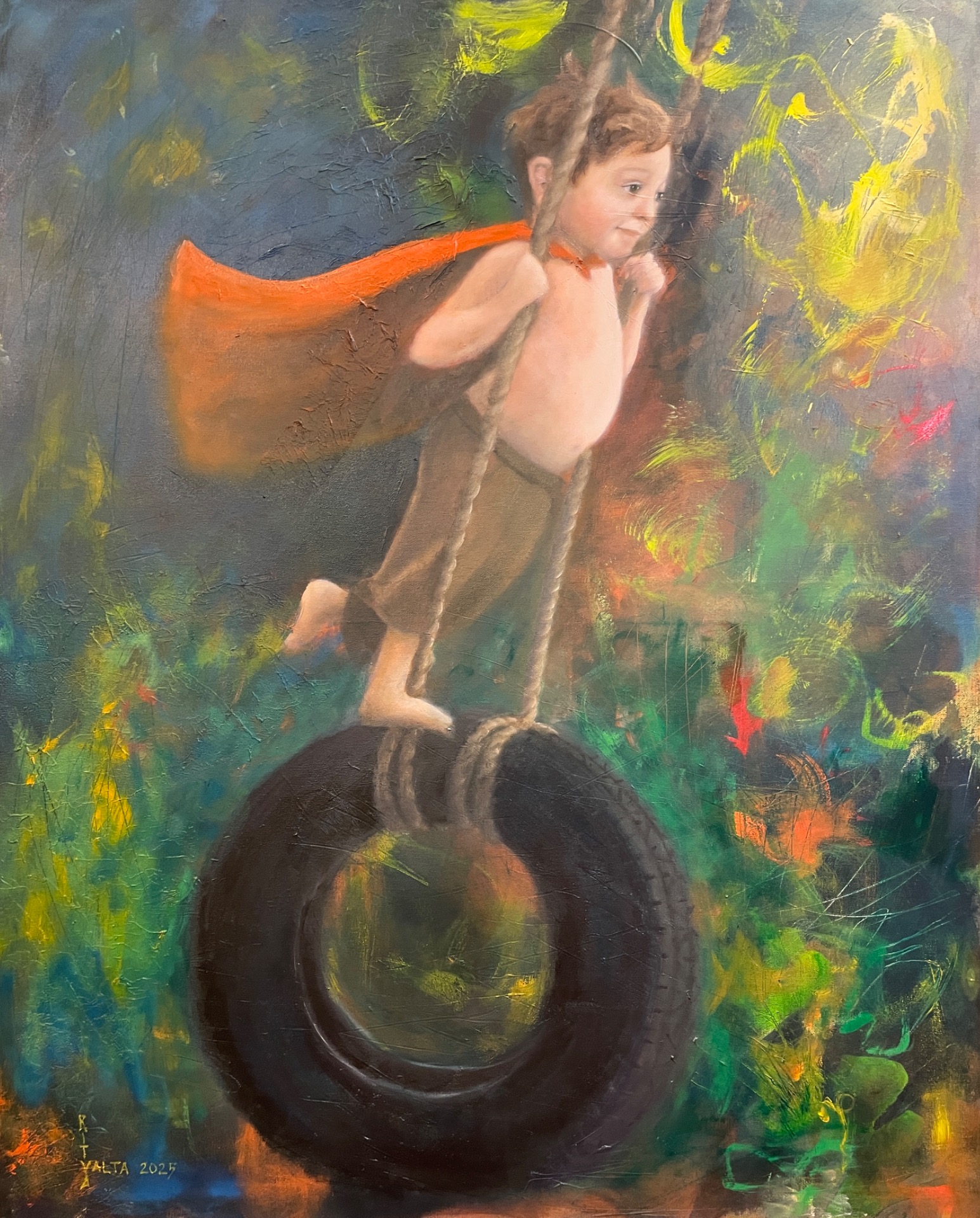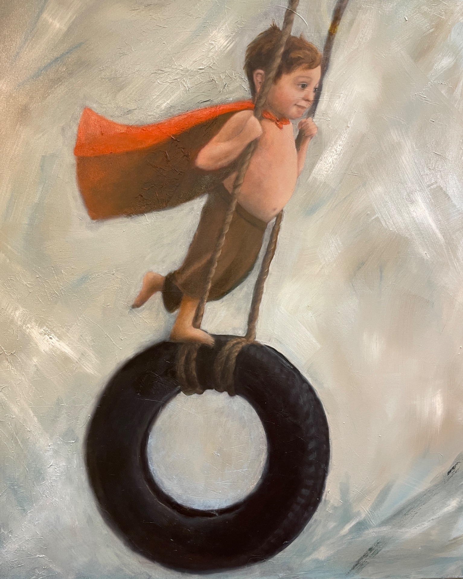 Oli outoa maalata näin nopeasti ja simppelisti. Aloitin akryyliväreillä ja viimeistelin öljyväreillä. Pidän hahmon yksinkertaisesta muotokielestä ja siitä, että hän ikäänkuin lohduttaa itseään.